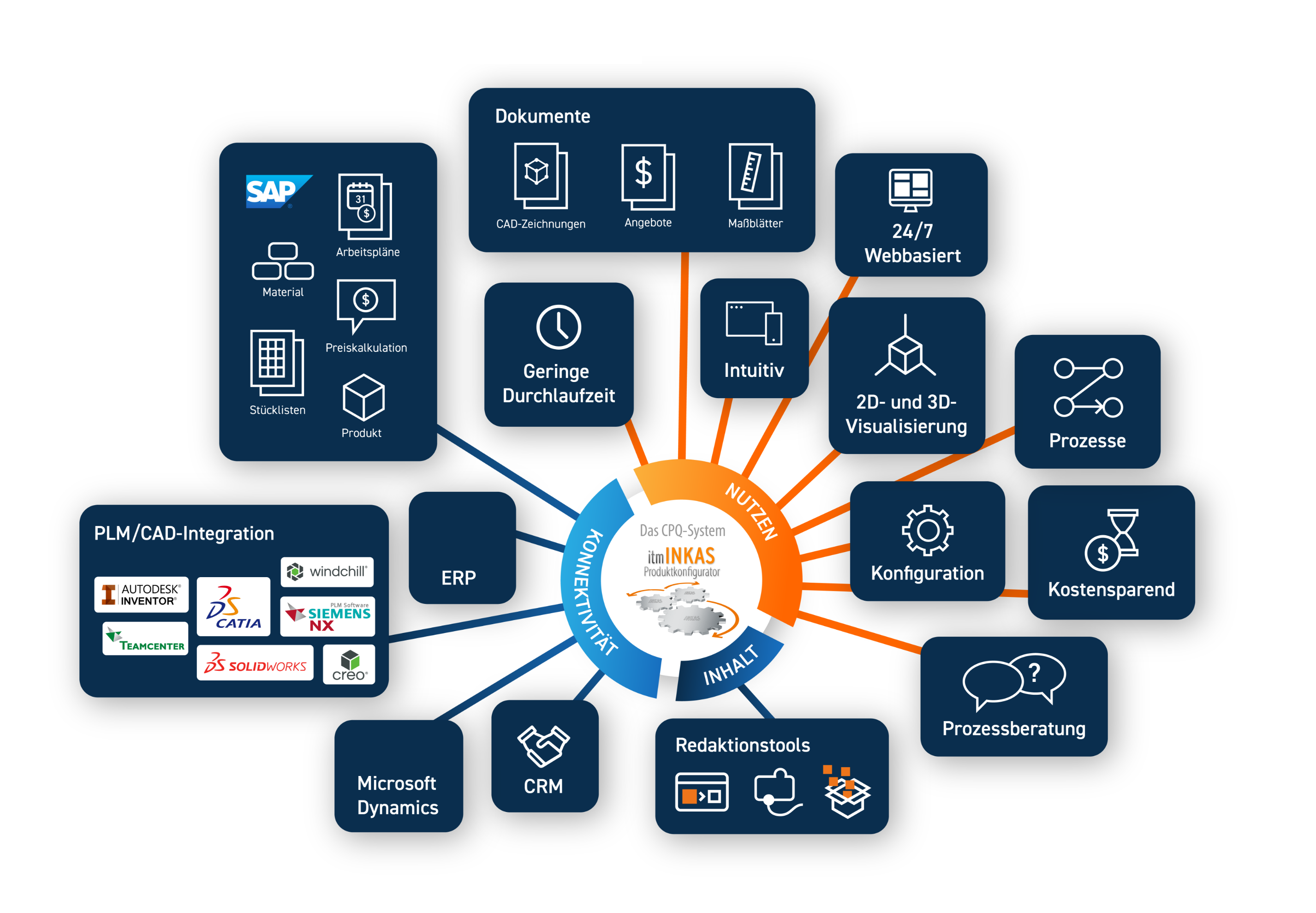 Fehlerfreie Angebote mit INKAS erstellen, sicher fertigen und liefern. Zielgruppen- spezifische Ansichten mit 3D-Visualisierung und 3D-Aufbau. Nutzen Sie die schnelle Outputgenerierung von Angebotsbelegen und -dokumenten. Nahtlose Kopplung mit Drittsystemen wie SAP, Windchill, Teamcenter, Creo, NX, Inventor und Vielem mehr. Reduzieren Die durch 360° Automatisierung und Vertriebsdigitalisierung Ihrer Lieferzeiten um über 50%. Startbereit für Industrie 4.0. durch fehlerfreie Angebote und Produktdokumentationen.